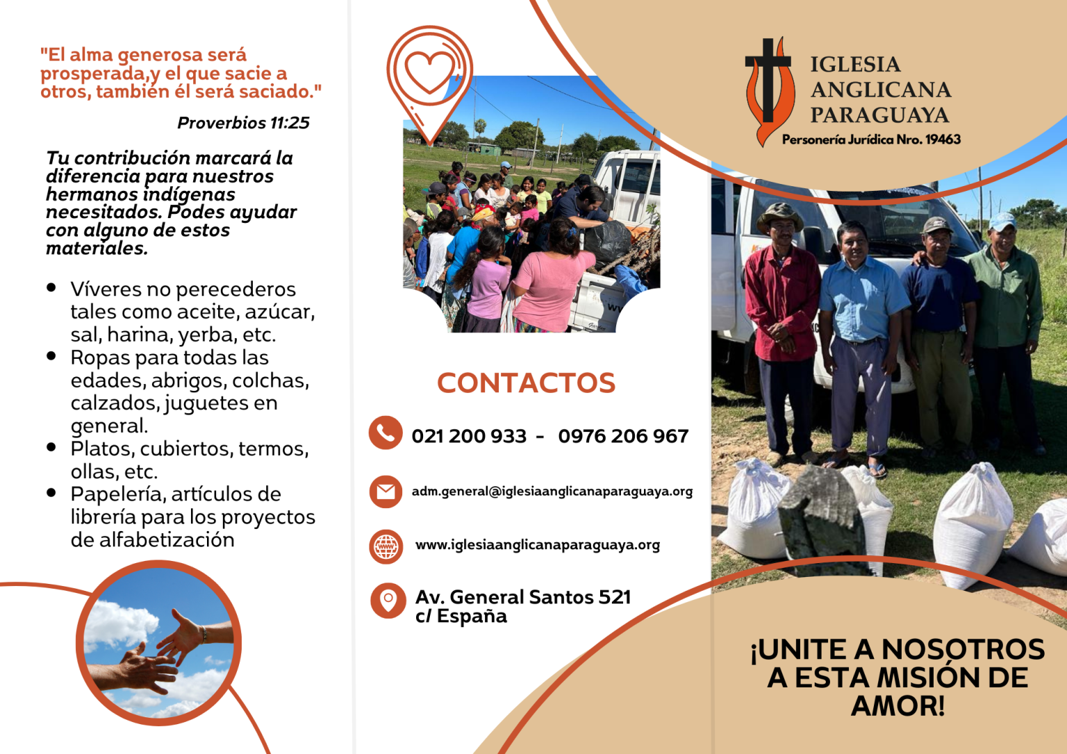 La Iglesia Anglicana Paraguaya desarrolla su misión en el Chaco paraguayo en conjunto con Church Mission Society (CMS), acompañando y sosteniendo el trabajo pastoral y comunitario en la región. A lo largo del año se realizan entre 10 y 12 viajes misioneros, que requieren una importante organización logística: el uso de los vehículos de la Diócesis, el viático para los equipos de trabajo y la provisión de alimentos para seis comunidades base. Estas acciones permiten fortalecer las congregaciones en funcionamiento y acompañar de manera cercana a los representantes de las distintas aldeas. Para que esta misión pueda continuar y crecer, la Iglesia invita a todos aquellos que deseen sumarse a colaborar mediante donaciones, contribuyendo así a sostener un trabajo que impacta vidas y comunidades enteras.